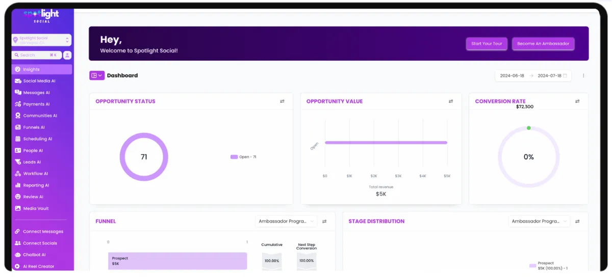 "We use Spotlight Social for the website, funnels, and automated messages AI. We used to spend hours responding to DMs every day. Highly recommended if you value your time and freedom."